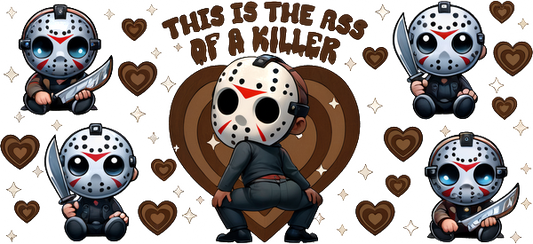 A playful and quirky illustration featuring a cartoonish character with a hockey mask, surrounded by hearts and a cheeky slogan.UV Transfers dtf prints