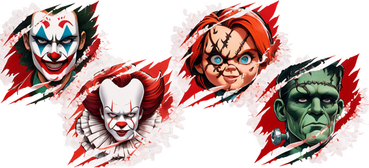 A dynamic illustration featuring four iconic horror characters: the Joker, Pennywise, Chucky, and Frankenstein, each depicted with vibrant details.UV Transfers heat press transfers