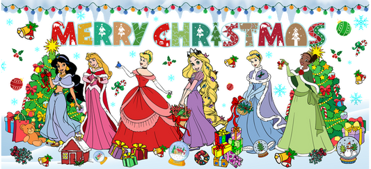 A festive illustration featuring beloved princesses in elegant holiday attire, celebrating Christmas with vibrant decorations and gifts.UV Transfers dtf prints
