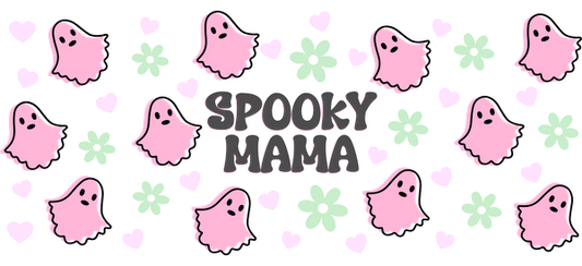 A playful design featuring cute pink ghosts, green flowers, and hearts with the text "Spooky Mama" in the center.UV Transfers dtf transfers