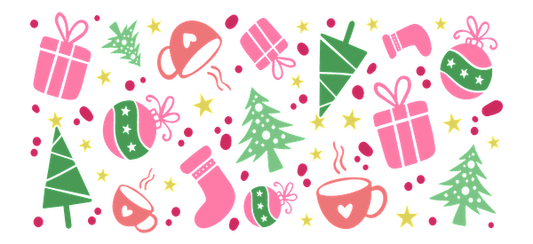 A vibrant collection of festive doodles featuring Christmas trees, gifts, cups of hot cocoa, and cheerful decorations in pink and green.UV Transfers dtf transfers