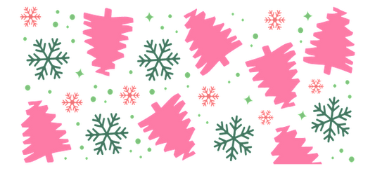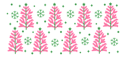 A whimsical pattern featuring pink trees and green snowflakes, perfect for adding a festive touch to any design.UV Transfers heat press transfers