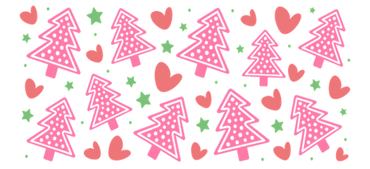 A playful pattern featuring pink Christmas trees, green stars, and red hearts, perfect for festive decorations or holiday crafts.UV Transfers heat press transfers