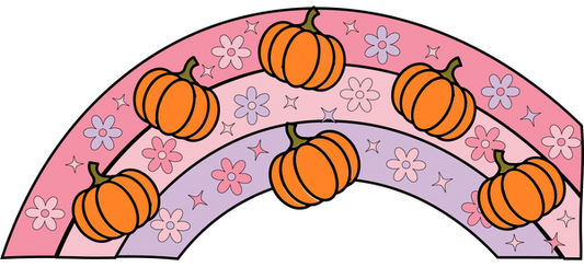 A charming illustration of a colorful rainbow adorned with orange pumpkins and delicate flowers, perfect for autumn decor!UV Transfers heat press transfers