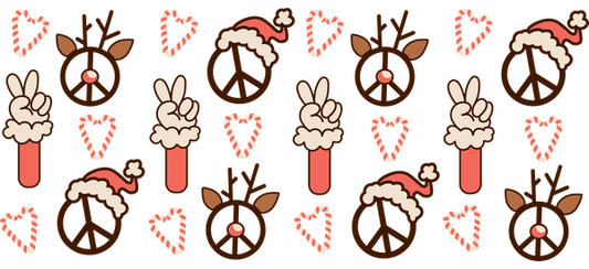 A playful pattern featuring reindeer, peace signs, candy hearts, and festive gloves, perfect for holiday-themed designs!UV Transfers dtf transfers