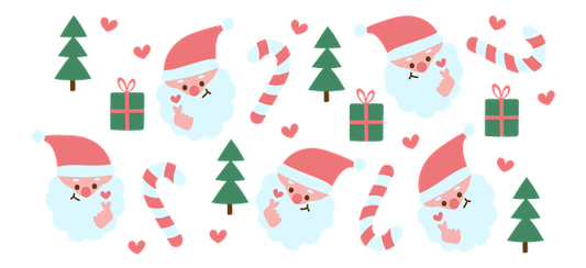 A cheerful holiday pattern featuring cute Santa Claus faces, candy canes, Christmas trees, gifts, and playful hearts in soft colors.UV Transfers dtf transfers