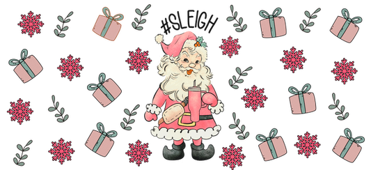 Celebrate the festive season with this cheerful vintage Santa holding a drink, surrounded by pink gifts and snowflakes!UV Transfersdtf regular iron