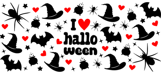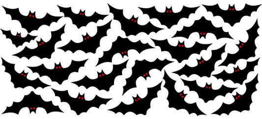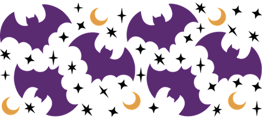 A playful pattern featuring purple bats and crescent moons set against a black background, perfect for Halloween decor!UV Transfers heat press transfers