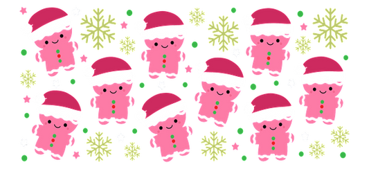 A festive pattern featuring cute pink gingerbread figures wearing Santa hats, surrounded by snowflakes and colorful decorations.UV Transfers heat press transfers