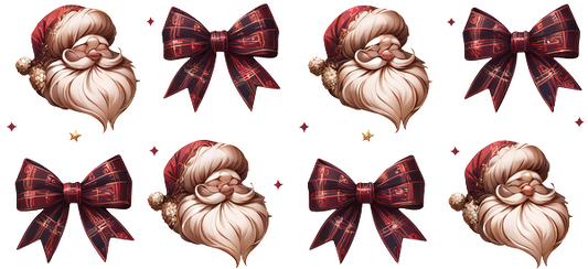 A festive collection of Santa Claus faces and red plaid bows, perfect for holiday-themed designs and decorations.UV Transfers dtf transfers