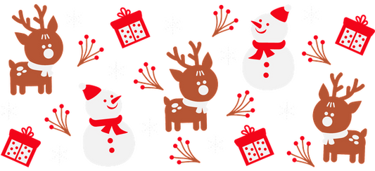 A whimsical holiday pattern featuring playful reindeer, cheerful snowmen, and festive gifts, all adorned with winter elements.UV Transfers dtf transfers