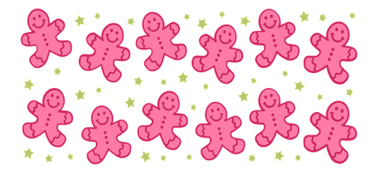 A cheerful lineup of pink gingerbread men surrounded by bright star accents, perfect for festive decorations or playful designs.UV Transfers dtf transfers