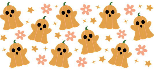 A fun and whimsical pattern featuring cute pumpkin ghosts surrounded by pink flowers and stars, perfect for Halloween decorations!UV Transfers heat press transfers