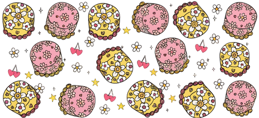 A delightful pattern featuring colorful macarons adorned with floral designs, butterflies, and stars, perfect for a charming touch.UV Transfers dtf transfers