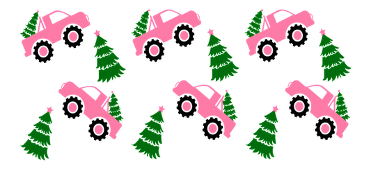 A playful pattern featuring pink trucks carrying vibrant green Christmas trees, perfect for festive designs and decorations.UV Transfers dtf transfers