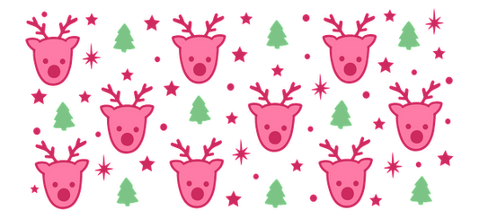 A cheerful pattern featuring pink reindeer heads, green Christmas trees, and festive snowflakes, perfect for holiday decorations!UV Transfers dtf transfers