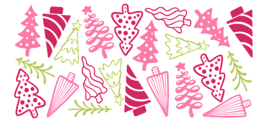 A vibrant, festive design featuring pink and green Christmas trees, ornaments, and swirls, perfect for holiday decorations!UV Transfers heat press transfers