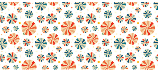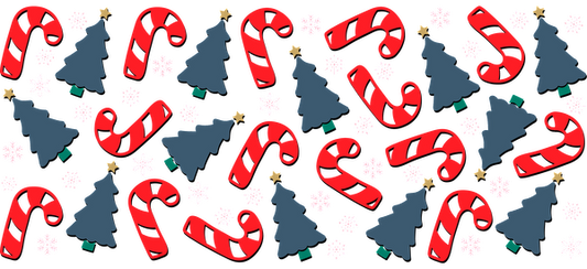 A festive pattern featuring cheerful red candy canes, green Christmas trees, and white snowflakes against a dark background.UV Transfers heat press transfers