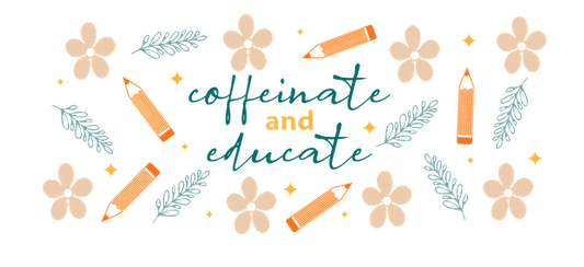 A colorful, whimsical design featuring the phrase "caffeinate and educate," surrounded by flowers and art supplies.UV Transfersdtf regular iron