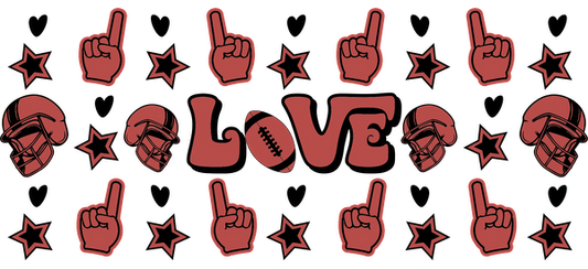A vibrant design featuring the word "LOVE" surrounded by football helmets, foam fingers, and star accents, perfect for sports enthusiasts.UV Transfers dtf prints