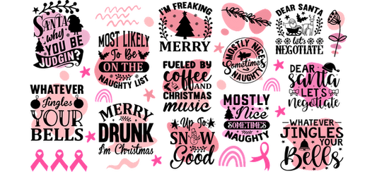 A playful collection of pink and black holiday-themed designs featuring fun phrases and festive motifs perfect for seasonal decor.UV Transfersdtf regular iron