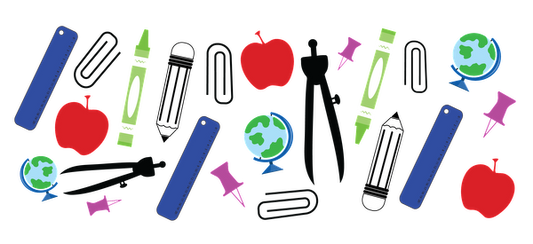A colorful assortment of school supplies, including pencils, crayons, paper clips, globes, and apples, perfect for a learning environment.UV Transfers dtf prints