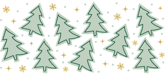 A festive pattern featuring green Christmas trees and sparkly gold snowflakes, perfect for holiday-themed designs.UV Transfersdtf regular iron