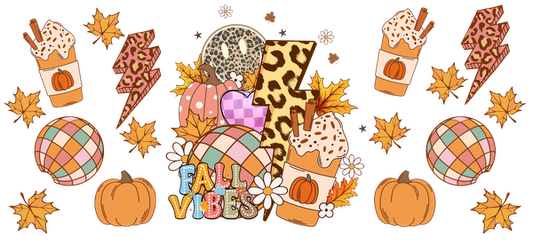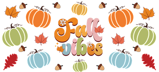 Celebrate autumn with vibrant pumpkins and colorful leaves in this cheerful "Fall Vibes" design!UV Transfers dtf transfers