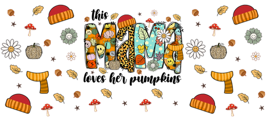 A playful and colorful "MOM" design featuring various patterns, flowers, and autumn-themed elements like scarves and mushrooms.UV Transfersdtf regular iron