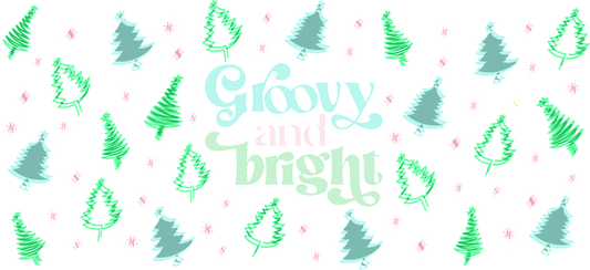 A vibrant and playful design featuring festive trees and the cheerful phrase "Groovy and Bright!" perfect for holiday decorations.UV Transfers dtf prints
