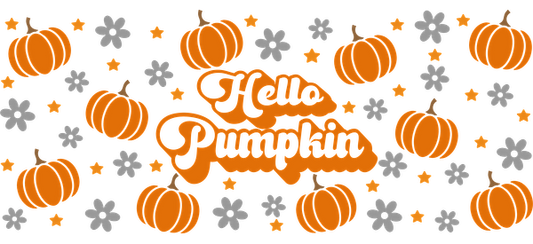 A festive design featuring bright orange pumpkins and cheerful snowflakes, with the text "Hello Pumpkin" in playful lettering.UV Transfersdtf regular iron