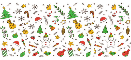 A festive pattern featuring Christmas trees, gifts, stars, and snowflakes in vibrant red, green, and yellow colors.UV Transfers dtf transfers