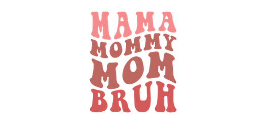 A playful design featuring various terms for "mom" with a funky, retro font in warm colors.UV Transfers heat press transfers