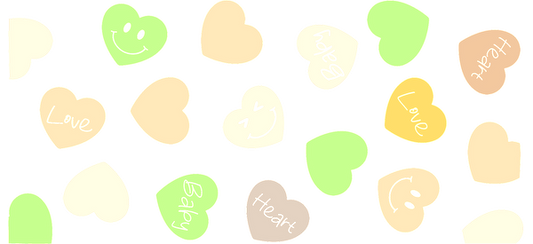 A colorful assortment of heart-shaped candies featuring messages like "Love," "Baby," and cheerful smiley faces.UV Transfers heat press transfers
