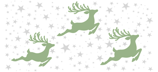 A whimsical design featuring green reindeer leaping amidst a flurry of silver stars, perfect for festive decorations.UV Transfers heat press transfers