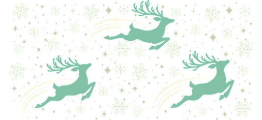 A whimsical winter design featuring leaping reindeer among intricate snowflake patterns in soothing mint green and white.UV Transfers dtf transfers