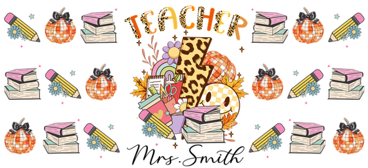 A vibrant and playful teacher-themed illustration featuring books, school supplies, and stylish patterns, celebrating the joy of education.UV Transfersdtf regular iron