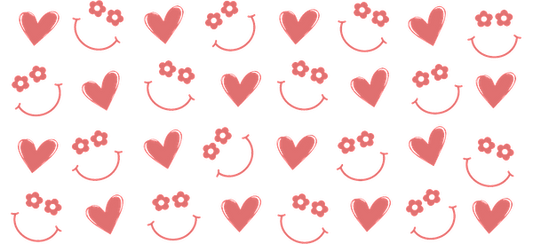 A charming pattern featuring hearts, smiling faces, and floral accents in soft pink tones, perfect for cheerful designs.UV Transfers heat press transfers