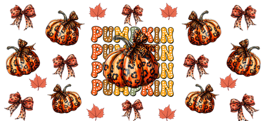 A vibrant autumn-themed design featuring leopard print pumpkins, decorative bows, and the word "PUMPKIN" in playful, bold letters.UV Transfers heat press transfers