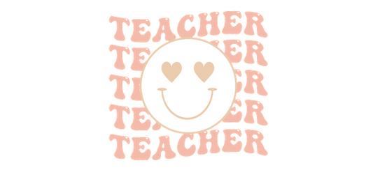 A playful design featuring the word "TEACHER" and a smiling face with heart eyes, celebrating educators.UV Transfers heat press transfers