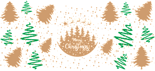A festive illustration featuring green trees, snowflakes, and a circular "Merry Christmas" greeting in a warm color palette.UV Transfers dtf prints