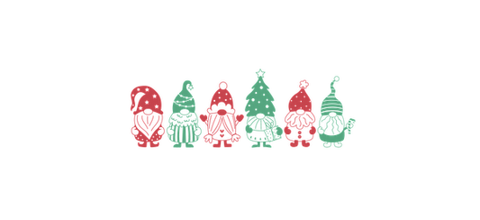 A cheerful lineup of colorful Christmas gnomes, showcasing festive outfits in red and green with playful holiday designs.UV Transfersdtf regular iron