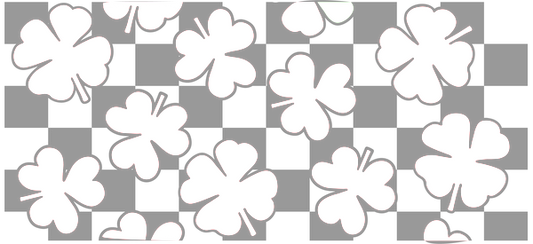 A playful pattern of white four-leaf clovers scattered over a black background, symbolizing luck and positivity.UV Transfers dtf transfers