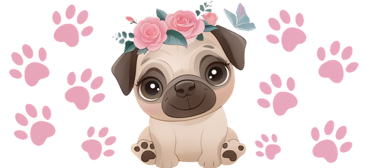 A cute, cartoon-style pug adorned with a floral crown, surrounded by pink paw prints and butterflies.UV Transfers dtf transfers