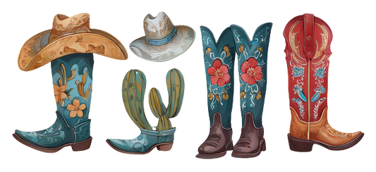 A vibrant collection of decorative cowboy boots and a stylish hat featuring floral and cactus designs, perfect for Western fashion enthusiasts.UV Transfers dtf transfers