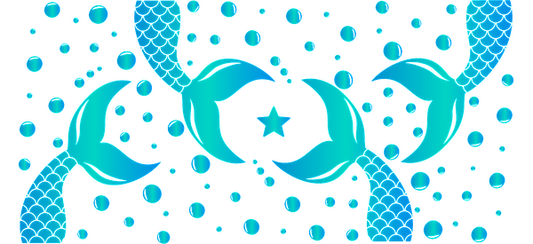 A vibrant design featuring blue mermaid tails and bubbles, complemented by a central star, creating a whimsical underwater theme.UV Transfers dtf transfers heat press transfers