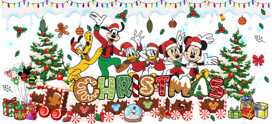 Celebrate the joy of Christmas with beloved characters Mickey, Donald, and friends, surrounded by festive trees and colorful gifts!UV Transfers dtf prints