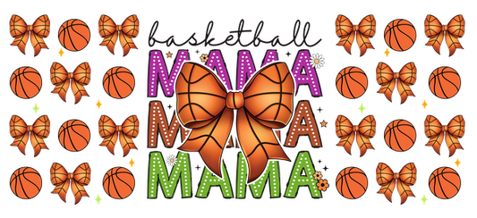 A vibrant design celebrating basketball moms, featuring colorful "MAMA" text, playful basketballs, and a large decorative bow.UV Transfersdtf regular iron