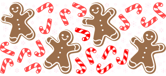 A festive pattern featuring cheerful gingerbread men and red candy canes, perfect for holiday-themed decorations.UV Transfers dtf transfers