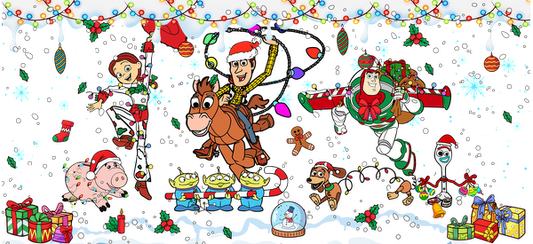 A festive scene featuring beloved animated characters celebrating Christmas with gifts, holiday decor, and a snowy backdrop.UV Transfersdtf regular iron